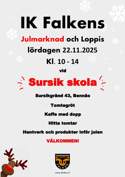 Lauantaina 22 marraskuuta 2025 klo 10-14 pidetään IK Falkenin joulumarkkinat ja kirpputori Sursikin koulussa. Osoite: Sursikintie 43, 68910 Pännäinen